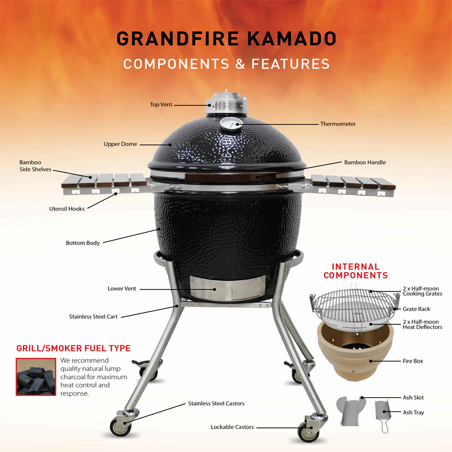 Elevate your grilling experience with the GrandFire Kamado 23" in Table – Classic or Deluxe. Built for both performance and style, this premium Kamado BBQ comes with a sturdy stainless steel table that’s as functional as it is sleek, offering the ultimate in convenience and versatility.